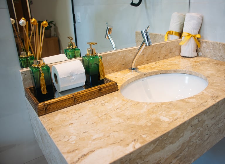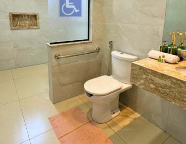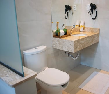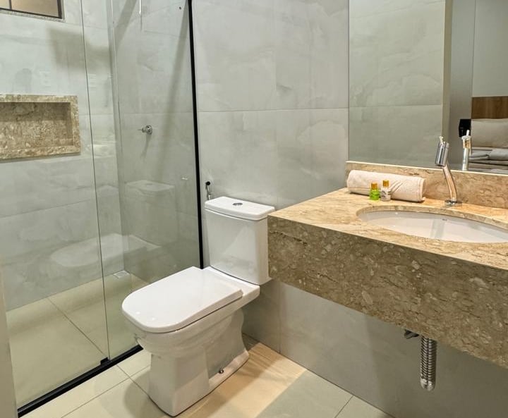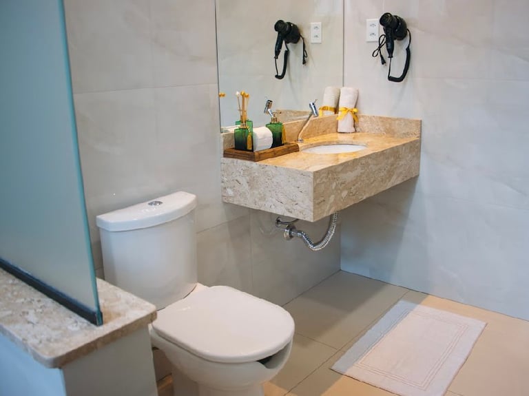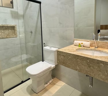 Os banheiros seguem o mesmo padrão de excelência, com acabamentos modernos, toalhas macias e amenities selecionados, para que cada hóspede se sinta verdadeiramente cuidado.