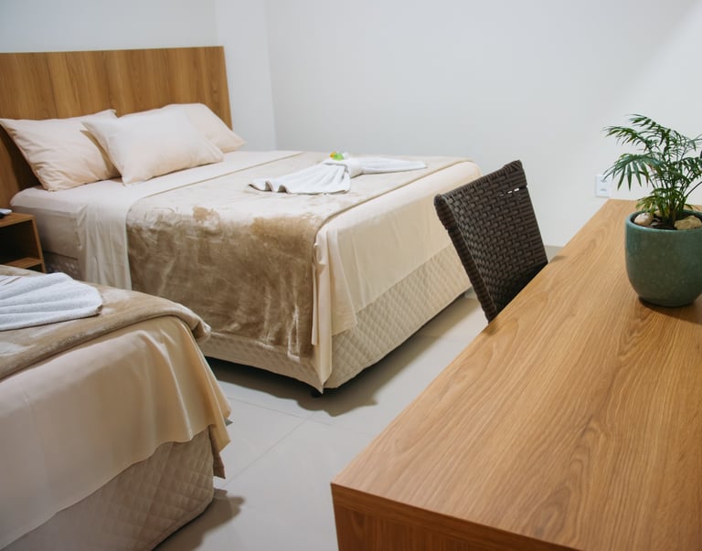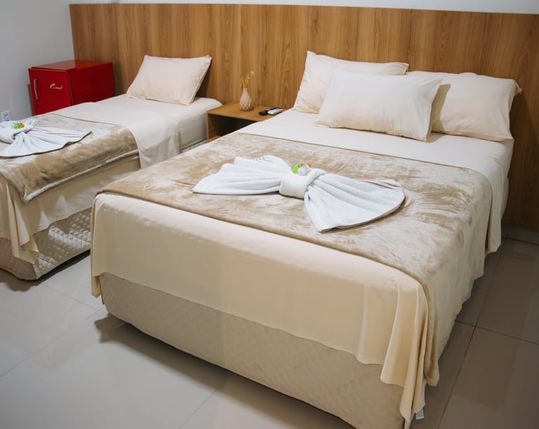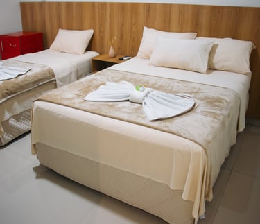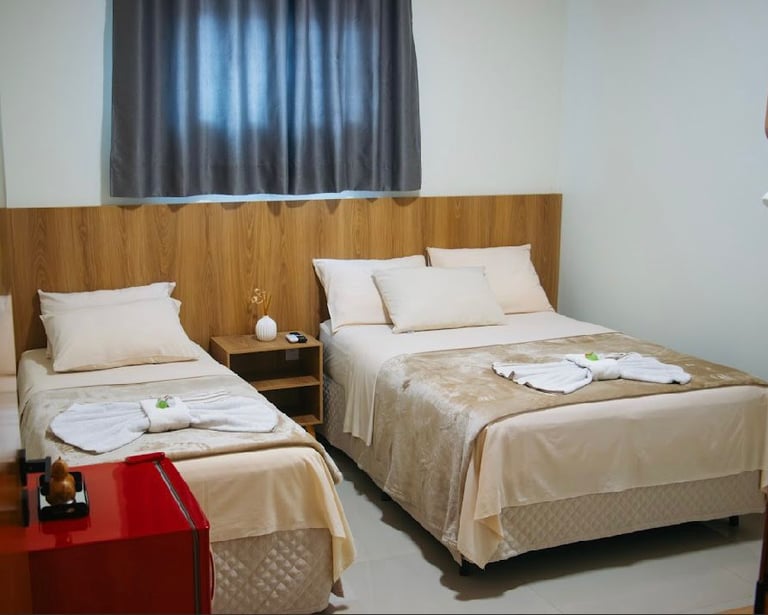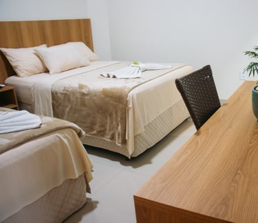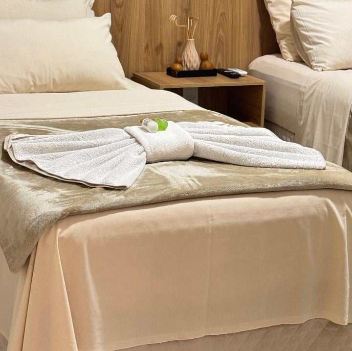 As acomodações são amplas, bem iluminadas e climatizadas, equipadas com camas espaçosas, enxovais de alta qualidade, TV, frigobar e Wi-Fi de alta velocidade, garantindo todo o conforto que você merece.