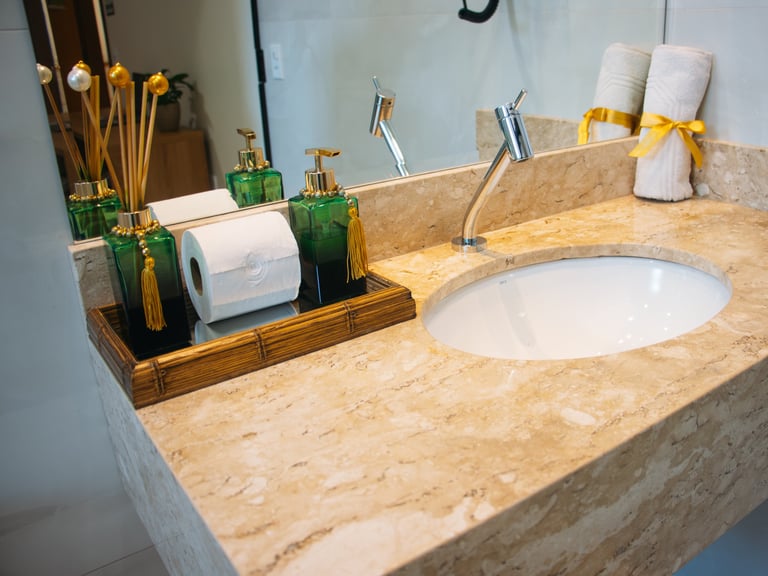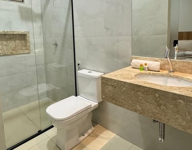 Os banheiros seguem o mesmo padrão de excelência, com acabamentos modernos, toalhas macias e amenities selecionados, para que cada hóspede se sinta verdadeiramente cuidado.